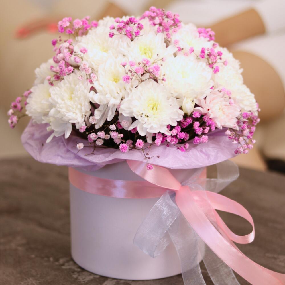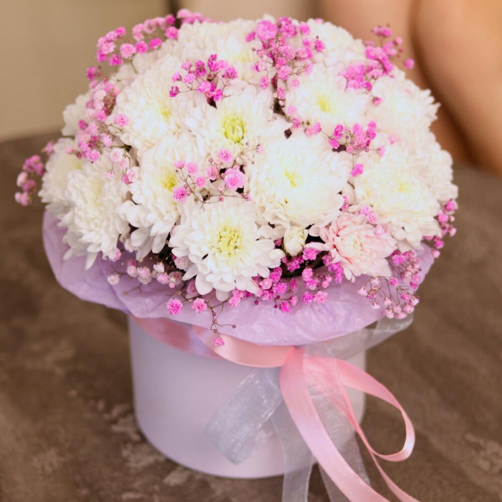 Эта нежная композиция из белых хризантем и розовой гипсофилы, оформленная в стильном и изысканном боксе, станет настоящим украшением любого праздника. Чистота белых цветов символизирует искренность и заботу, а розовая гипсофила добавляет легкости и романтики. Такой букет создан для девушки, жены, любимой, подруги. Подарите эту изящную композицию, и она станет прекрасным знаком вашей любви и внимания.